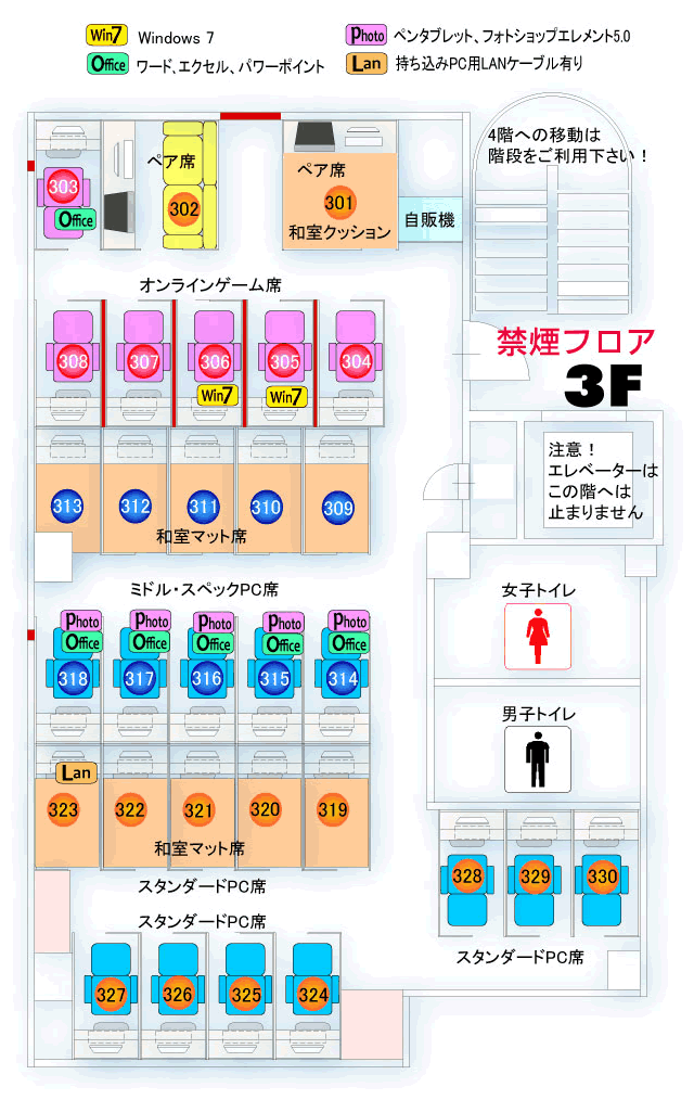 ●エレベーターは、4Fのみに止まります。(3F、5Fへは止まりません。) 3F及び5Fへは外階段をご利用下さい。